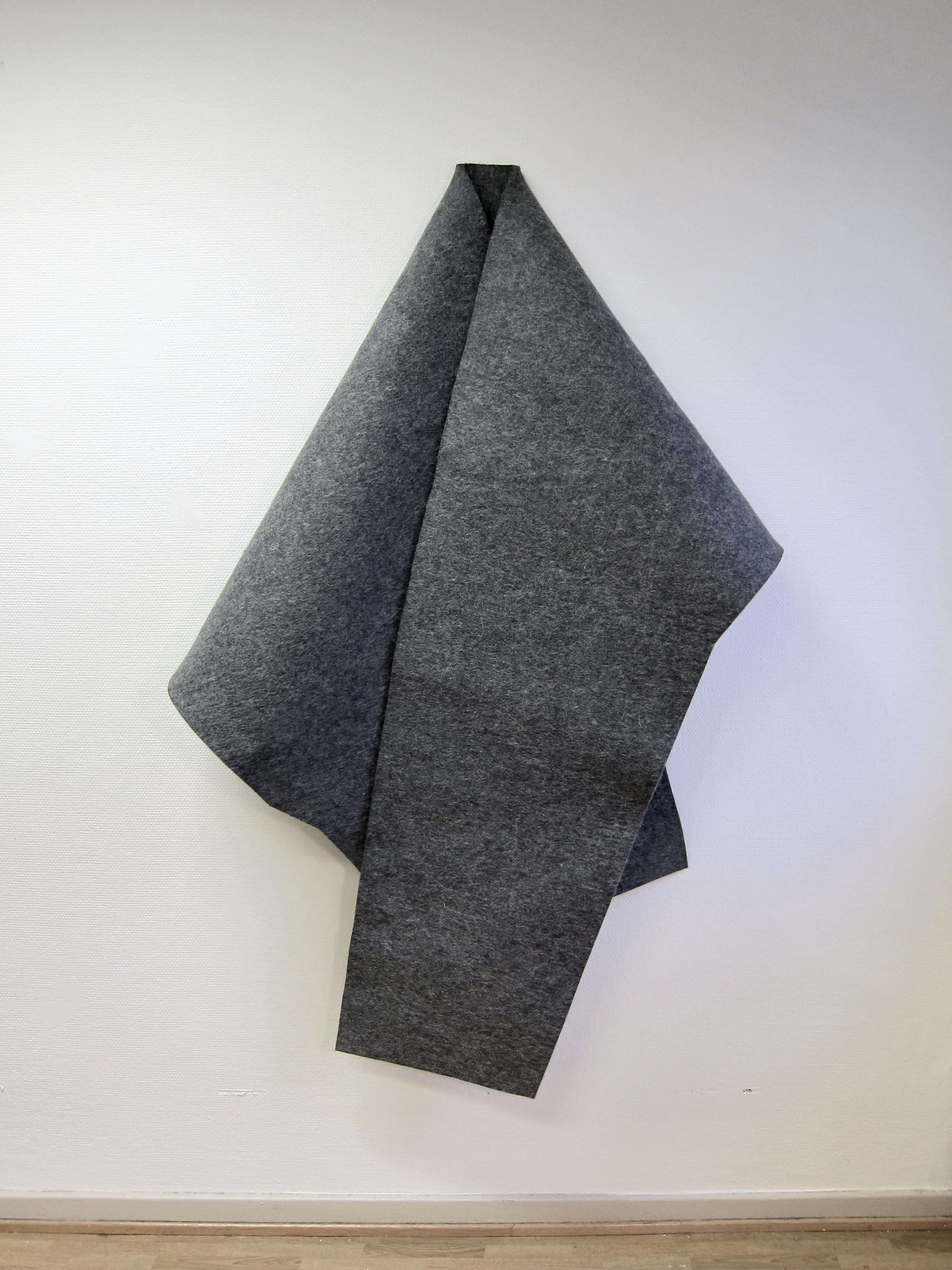 Sense and Sensibility are sculptures in felt, based on city maps of areas where Lidal has lived and worked, in Oslo and Berlin. The felt maps are precisely cut out of thick hand made felt, but they loose their meaning as maps when they are hung collapsed on the wall and floor. The information that was in the map, becomes minimal, abstract, hard to read, even though it’s tempting to look for familiar elements. The felted maps get a new logic, they become form and material that needs to be experienced in the space, rather than understood with reason. At the same time, new landscapes, new maps, new spaces and new meaning appear.